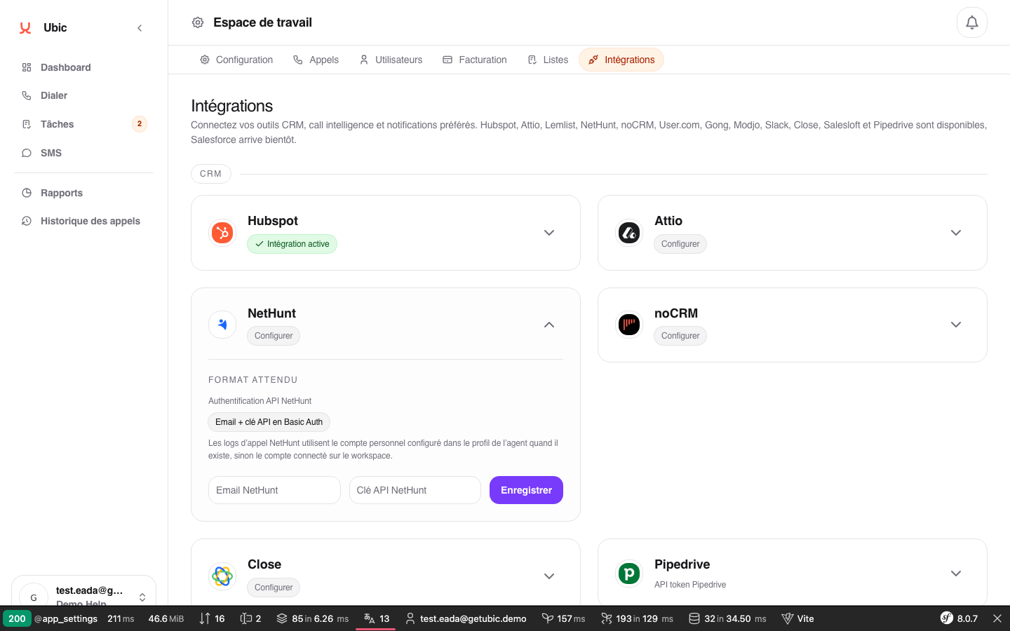 Ouvrir Paramètres > Intégrations > NetHunt.