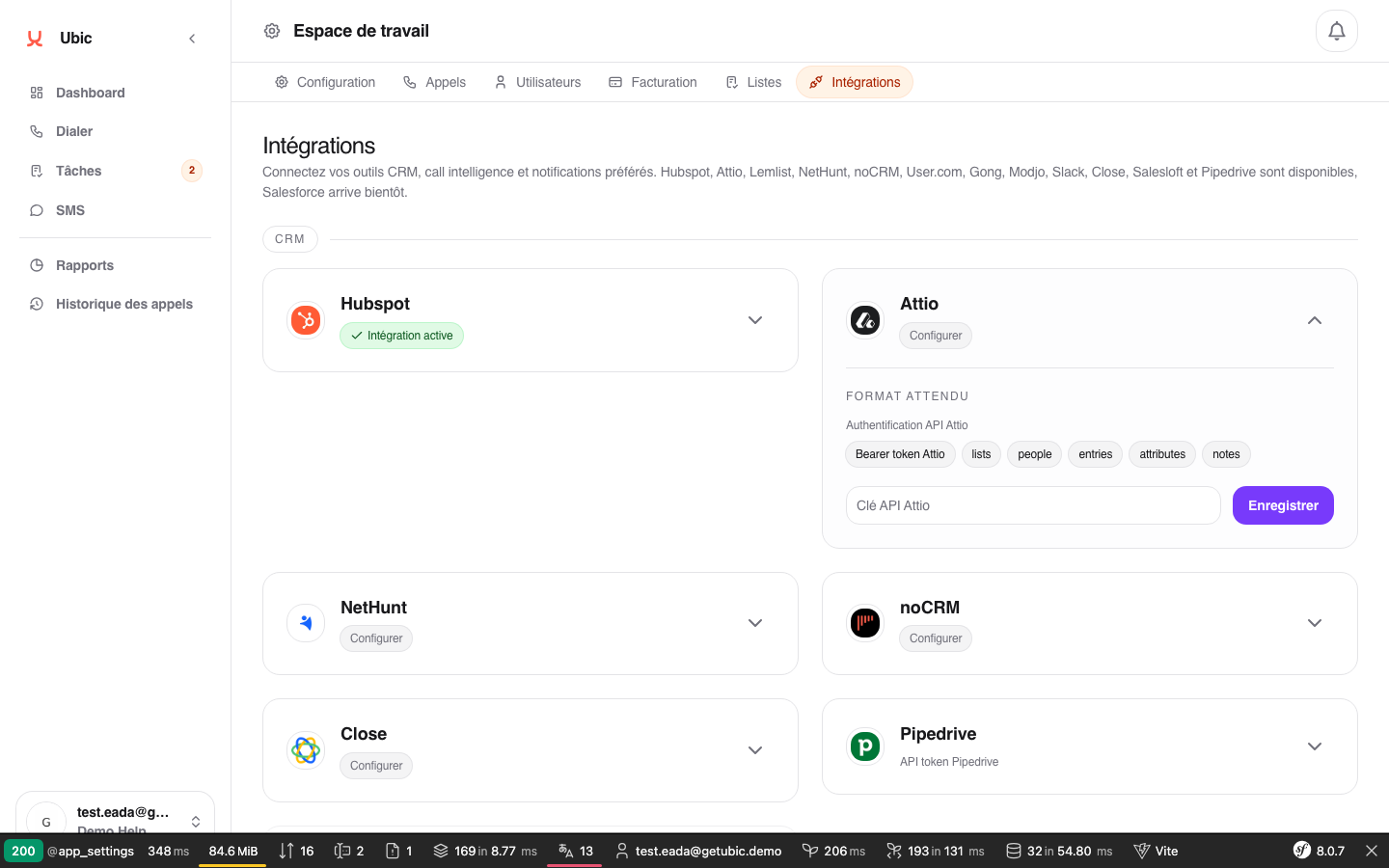 Ouvrir Paramètres > Intégrations > Attio dans Ubic.
