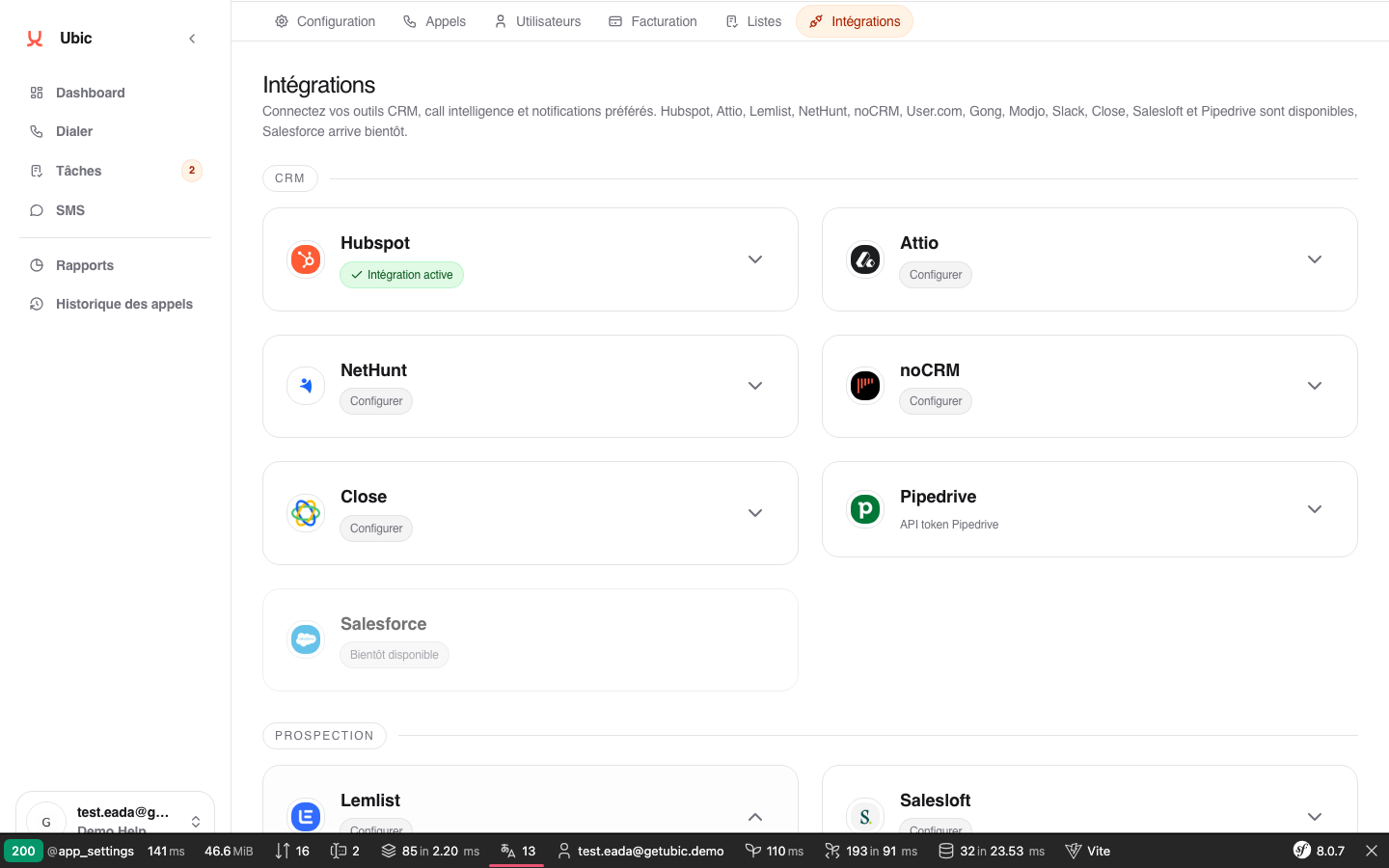 Ouvrir Paramètres > Intégrations > Lemlist dans Ubic.