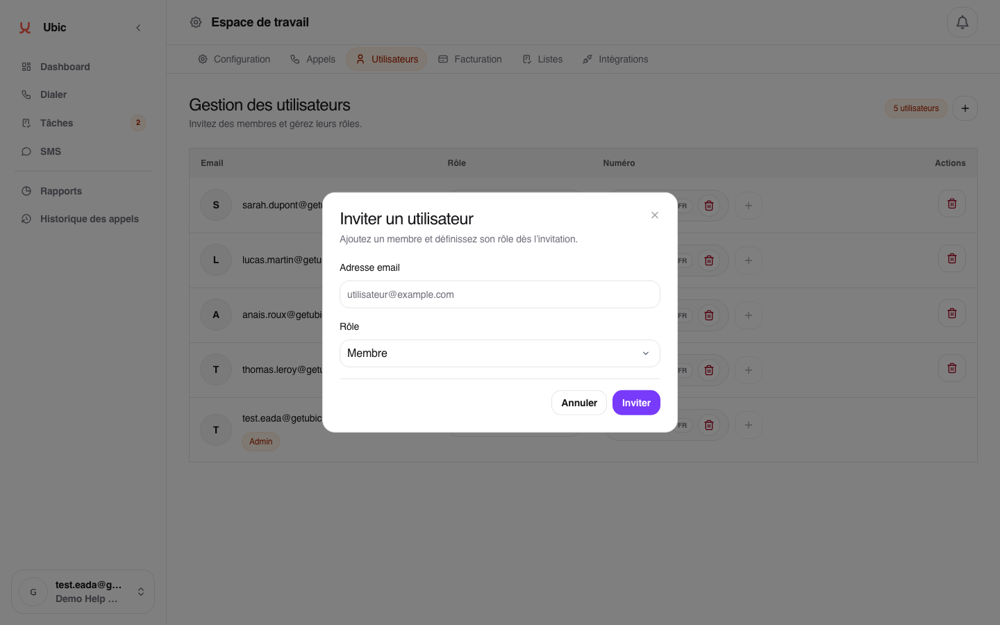 Admin : peut inviter, configurer les intégrations, régler la stratégie d'appels, gérer la facturation et supprimer un utilisateur.