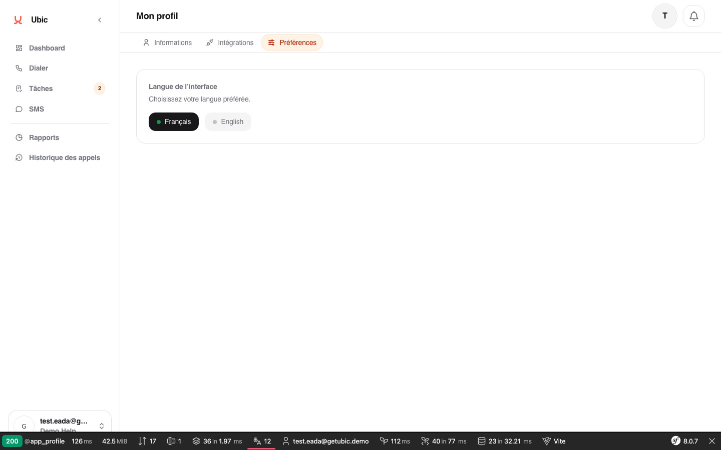 La langue s'applique à l'interface et aux emails transactionnels envoyés par Ubic.