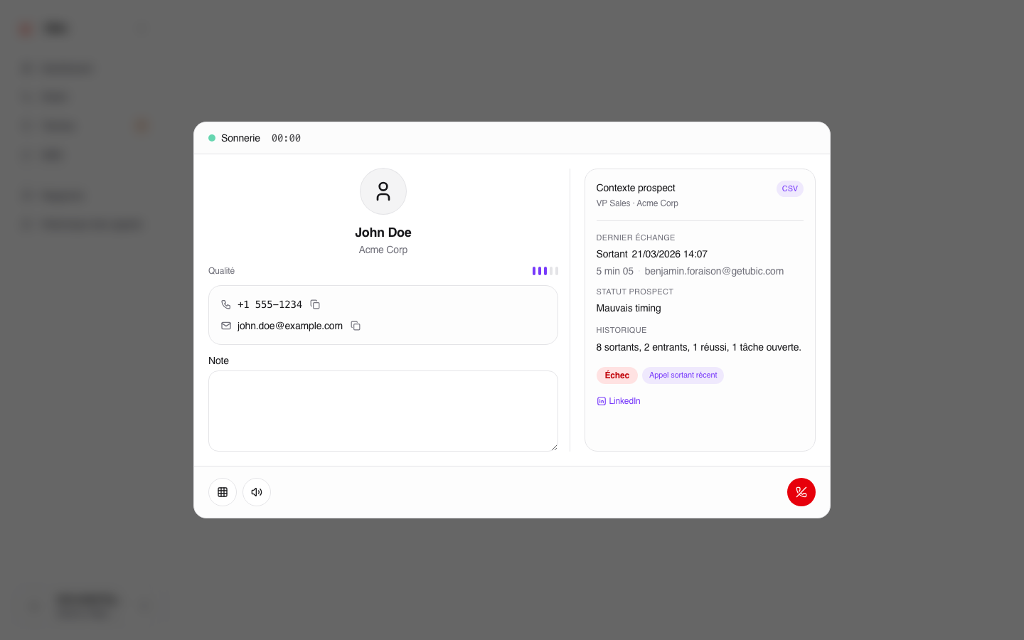 Cet appel de démonstration est utile juste après la création du compte, avant d'avoir assigné un numéro réel ou importé une liste de prospects. Il permet de voir à quoi ressemble la fiche prospect, les boutons de qualification et l'écran de fin d'appel.