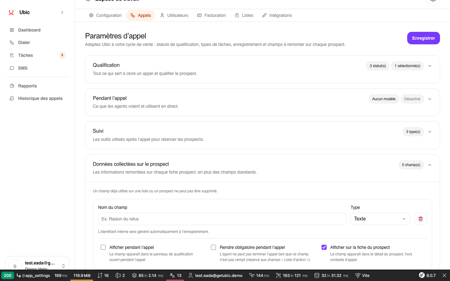 Définir la visibilité : visible pendant l'appel, visible dans la fiche prospect, obligatoire en appel.